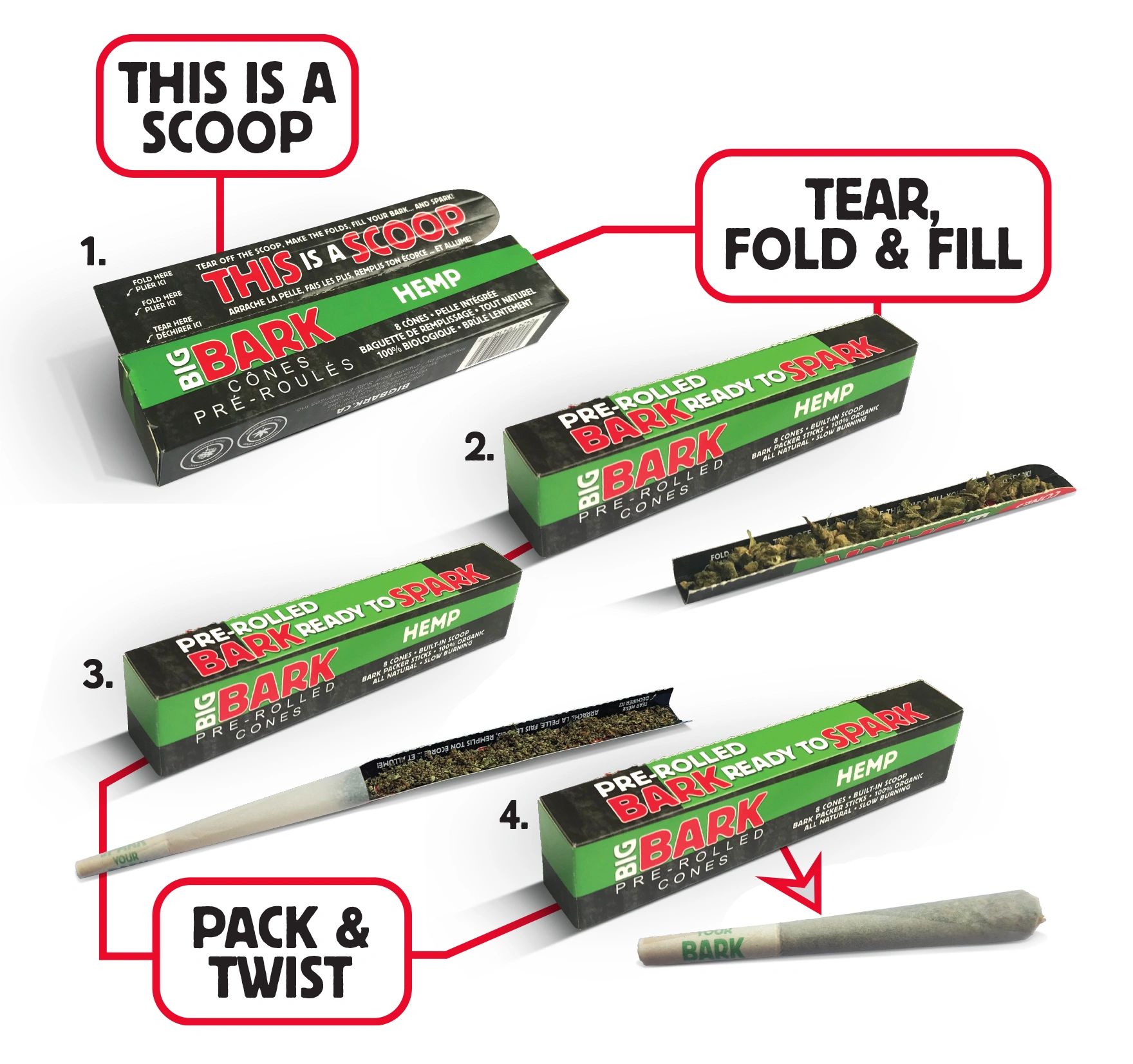 We are proud to introduce to you, the BigBark Rolling Papers Scoop! The merchandising tab on the top of each pack of BigBark Pre-Rolled Cones doubles as a filling tool to help make the process of rolling that much easier and so much more efficient. Just tear off the scoop, fold on the scores, fit the end of the scoop into your BigBark Pre-Rolled Cone, slide in your herb, packing it down with the packer sticks included in the pack and repeat! When you're done, tie it off and spark your bark!